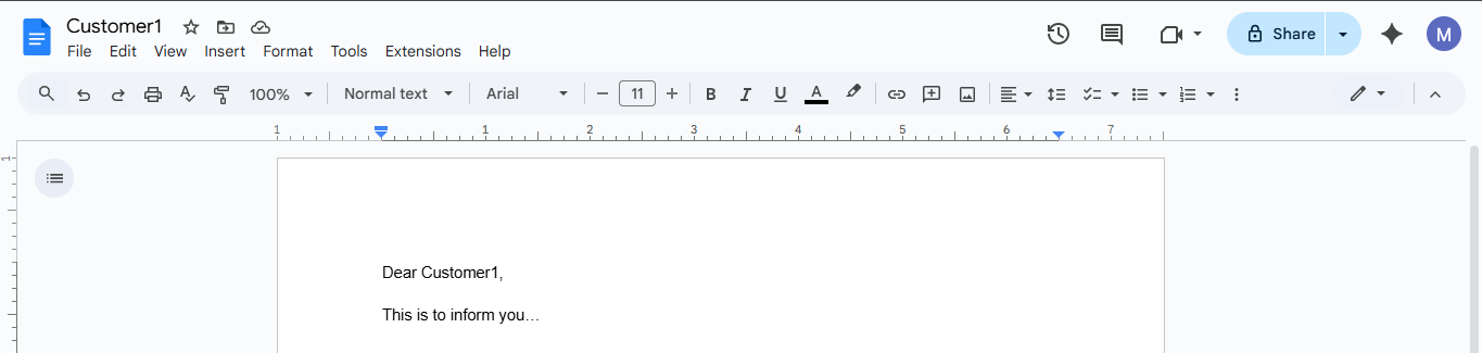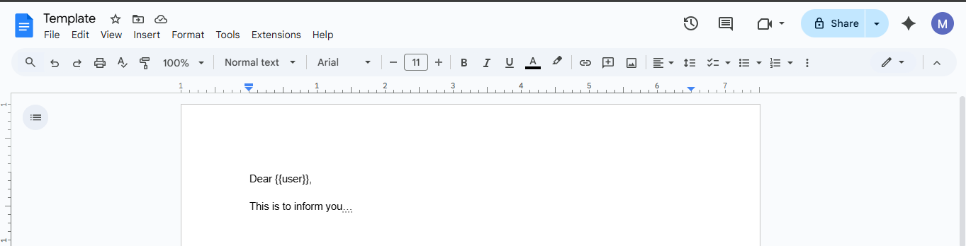To make a template, create a Google Doc from your Google workspace as per your requirement. Wherever you want the value to be replaced by monday column value, put double curly braces like {{}}. Inside the double curly braces, put a variable name. The variable name could be anything, but keep a name that will help you understand it later. You will need to fill these variable names while setting up the automation.