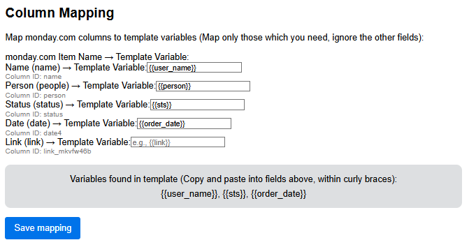 Step - 4 : Map the monday column values to the template variables. On the left side you can see the name of the monday column. On the right you will see a box. Put the variable name from your template (that you have selected in step 3), inside the curly braces. Click ‘Save mapping’. See the template guide here to understand more about this step.