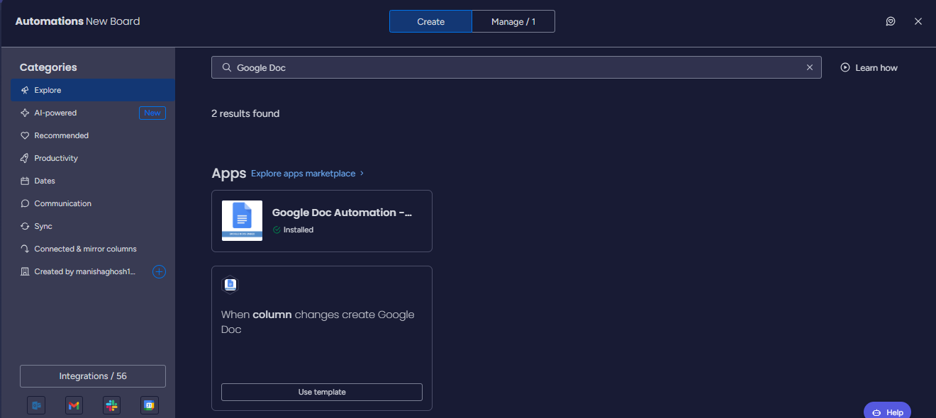 From the automation center of your board, go to create option at top and search ‘Google Doc Automation’